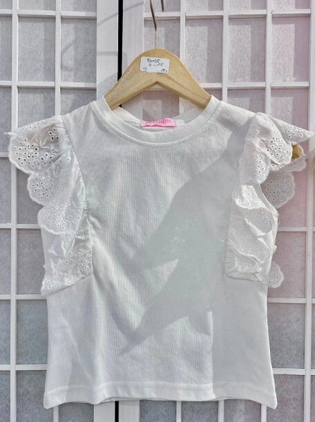 T-shirt fille en coton 100%, manches dentelle, idéal pour printemps/été. Parfait pour une touche chic décontractée.